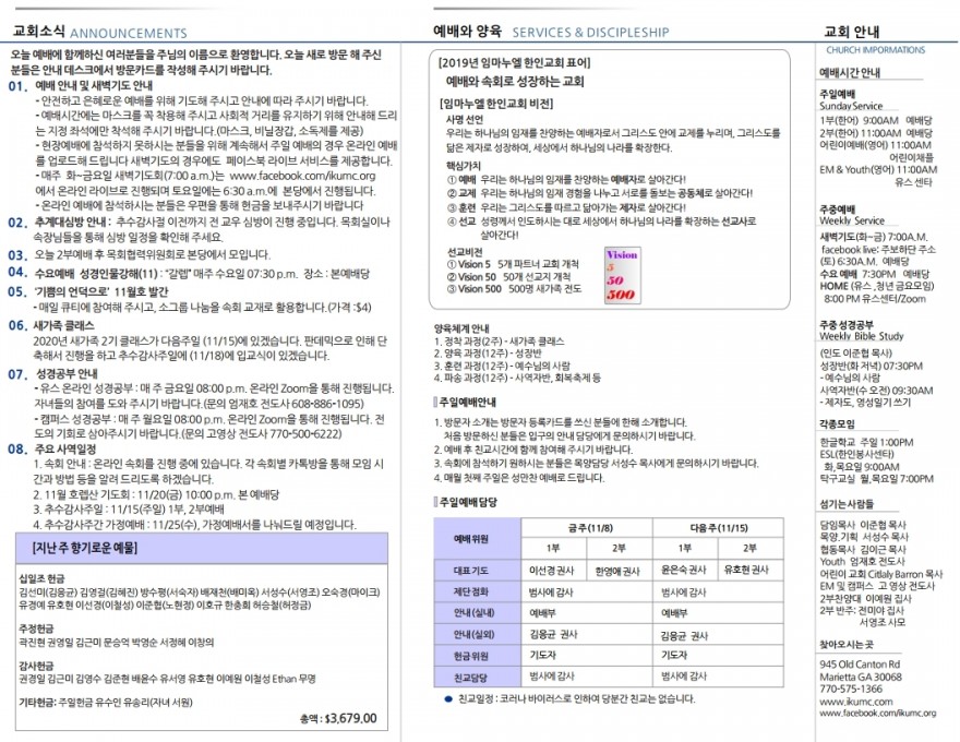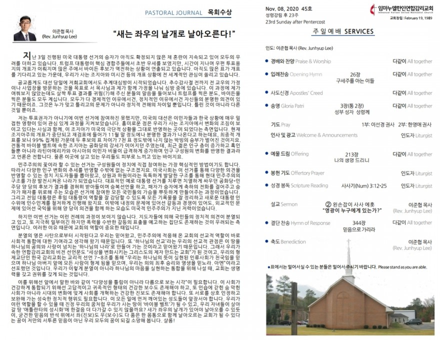 2020년 11월 8일 주일예배 주보 페이지 정보 작성자 임마누엘한인연합감리교회 댓글 0건 조회 4,578회 작성일 20-11-09 02:32 본문 2020년 11월 8일 주일예배 주보 목록 이전글2020년 11월 15일 주일예배 주보 20.11.16 다음글2020년 11월 1일 주일예배 주보 20.11.02