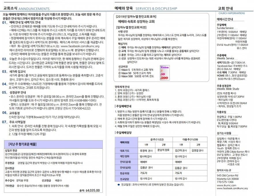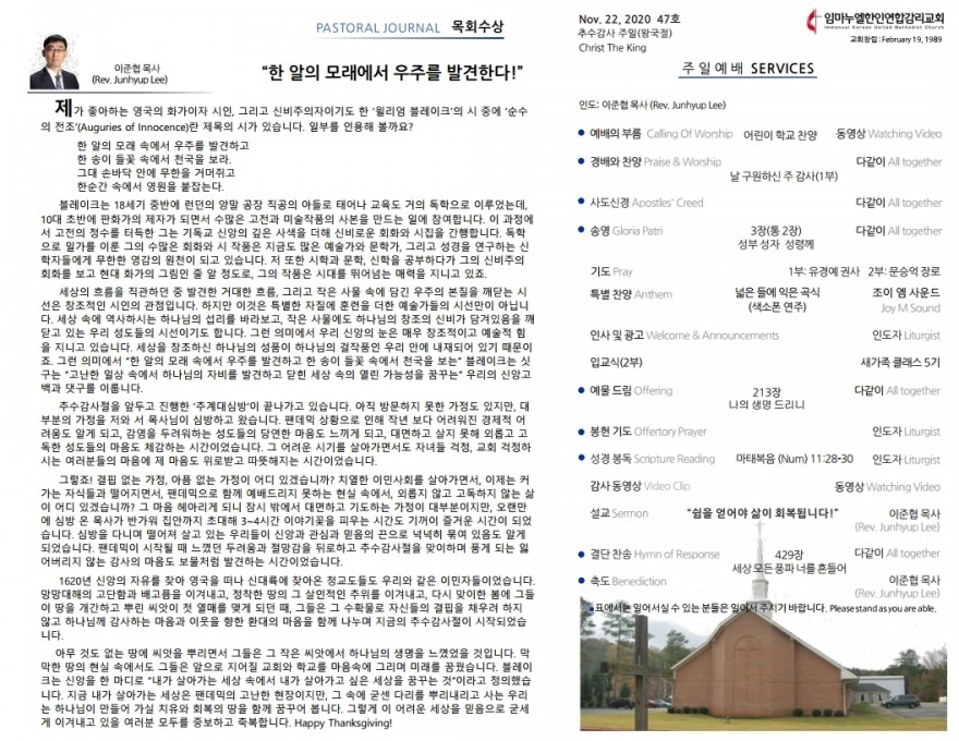 2020년 11월 22일 주일예배 주보 페이지 정보 작성자 임마누엘한인연합감리교회 댓글 0건 조회 4,627회 작성일 20-11-23 02:44 본문 2020년 11월 22일 주일예배 주보 목록 이전글2020년 11월 29일 주일예배 주보 20.11.30 다음글2020년 11월 15일 주일예배 주보 20.11.16