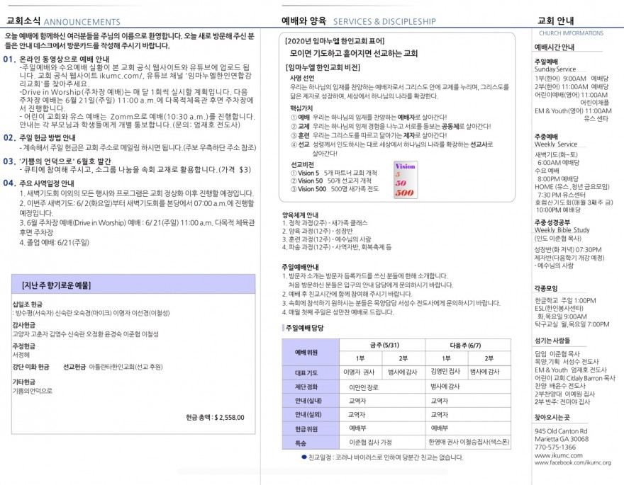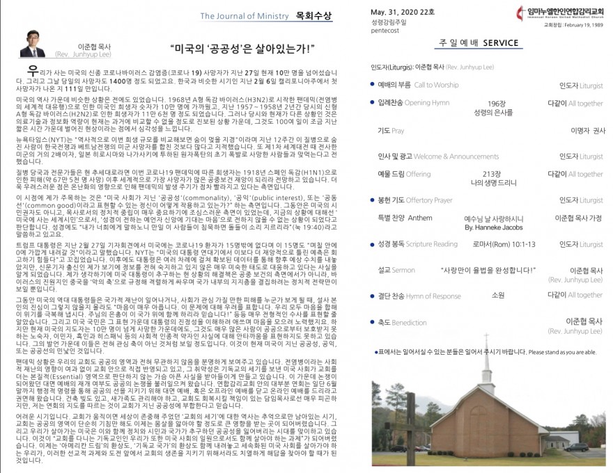 2020년 5월 31일 주일예배 주보 페이지 정보 작성자 임마누엘한인연합감리교회 댓글 0건 조회 5,257회 작성일 20-06-01 01:24 본문 2020년 5월 31일 주일예배 주보 목록 이전글2020년 6월 7일 주일예배 주보 20.06.08 다음글2020년 5월 24일 주일예배 주보 20.05.24