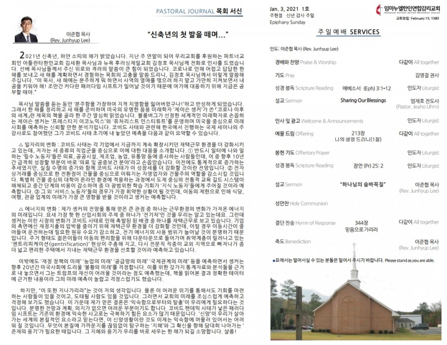 2021년 1월 3일 주일예배 주보 페이지 정보 작성자 임마누엘한인연합감리교회 댓글 0건 조회 5,099회 작성일 21-01-04 02:53 본문 2021년 1월 3일 주일예배 주보 목록 이전글2021년 1월 10일 주일예배 주보 21.01.11 다음글2020년 12월 27일 주일예배 주보 20.12.28