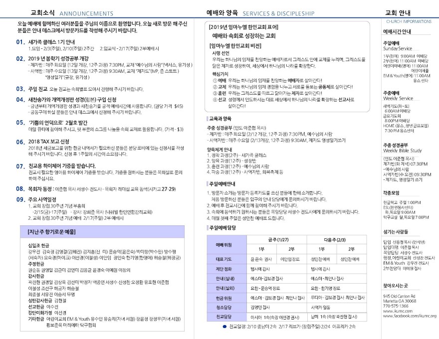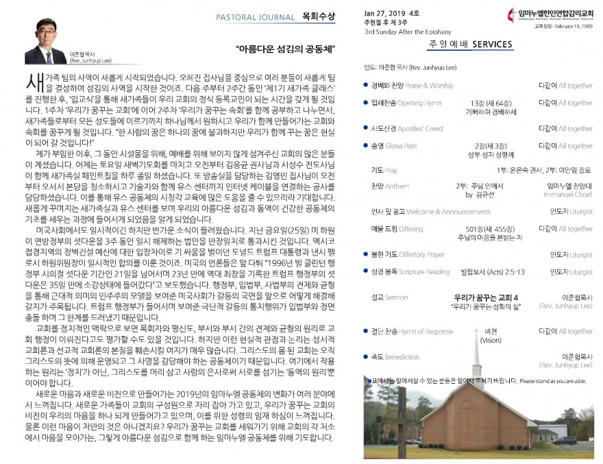 2019년 1월 27일 주보 페이지 정보 작성자 임마누엘한인연합감리교회 댓글 0건 조회 5,604회 작성일 19-01-28 05:58 본문 2019년 1월 27일 주보 목록 이전글2019년 2월 3일 주보 19.02.03 다음글2019년 1월 20일 주보 19.01.23