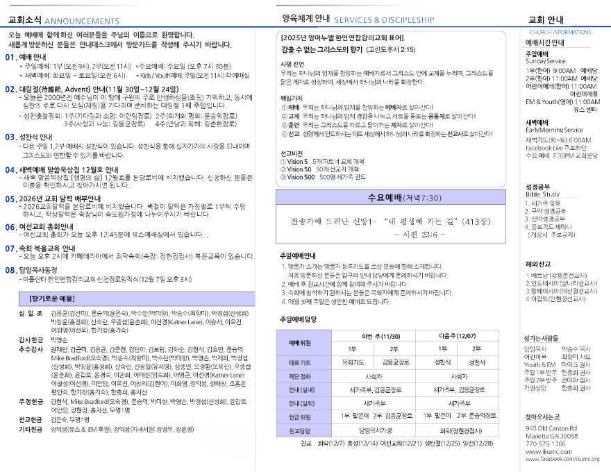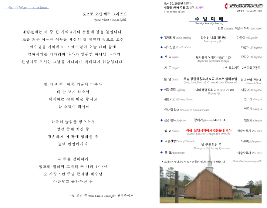 2025년 11월 30일 페이지 정보 작성자 임마누엘한인연합감리교회 댓글 0건 조회 763회 작성일 25-11-30 00:50 본문 2025년 11월 30일 목록 이전글2025년 12월 7일 25.12.07 다음글2025년 11월 23일 25.11.23