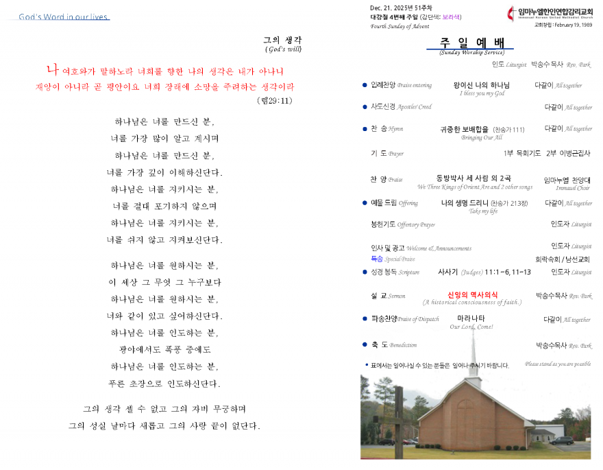 2025년 12월 21일 페이지 정보 작성자 임마누엘한인연합감리교회 댓글 0건 조회 393회 작성일 25-12-21 03:05 본문 2025년 12월 25일 목록 이전글2025년 12월 28일 25.12.28 다음글2025년 12월 14일 25.12.14