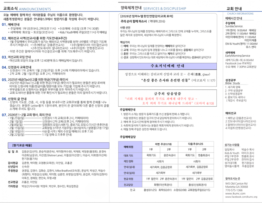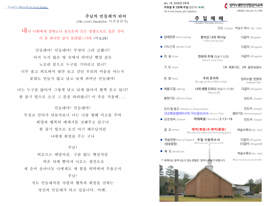 2026년 1월 18일 페이지 정보 작성자 임마누엘한인연합감리교회 댓글 0건 조회 438회 작성일 26-01-18 01:30 본문 2026년 1월 18일 목록 이전글2026년 1월 25일 26.01.25 다음글2026년 1월 11일 26.01.11