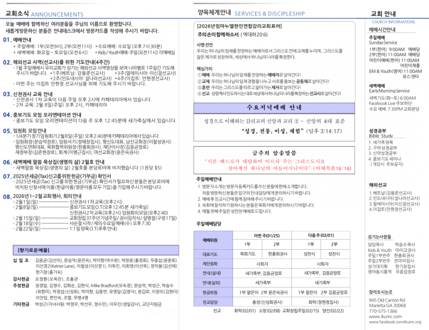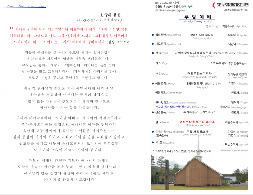 2026년 1월 25일 페이지 정보 작성자 임마누엘한인연합감리교회 댓글 0건 조회 409회 작성일 26-01-25 00:20 본문 2026년 1월 25일 목록 이전글2026년 2월 1일 26.02.01 다음글2026년 1월 18일 26.01.18