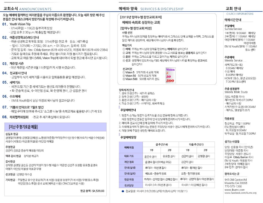 2019년 7월 14일 페이지 정보 작성자 임마누엘한인연합감리교회 댓글 0건 조회 5,613회 작성일 19-07-14 21:39 본문 2019년 7월14일 주보 목록 이전글2019년 7월 21일 19.07.21 다음글2019년 7월 7일 주보 19.07.08