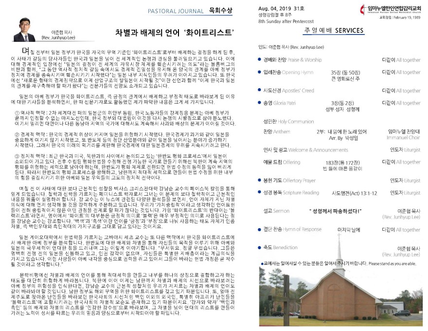 2019년 8월4일 주보 페이지 정보 작성자 임마누엘한인연합감리교회 댓글 0건 조회 5,623회 작성일 19-08-05 02:19 본문 2019년 8월4일 주보 목록 이전글2019년 8월11일 주보 19.08.11 다음글2019년 7월 28일 주보 19.07.29