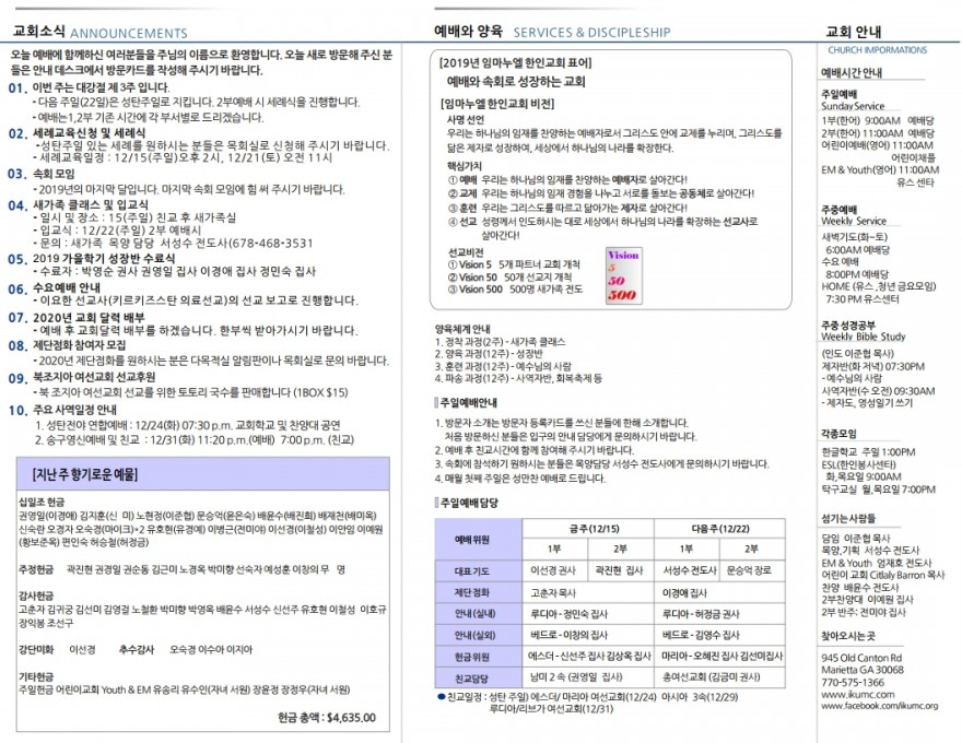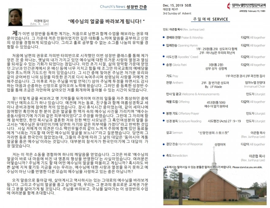 2019년 12월 15일 주일예배 주보 페이지 정보 작성자 임마누엘한인연합감리교회 댓글 0건 조회 5,397회 작성일 19-12-16 03:49 본문 2019년 12월 15일 주일예배 주보 목록 이전글2019년 12월 22일 주일예배 주보 19.12.23 다음글2019년 12월 8일 주일예배 주보 19.12.09