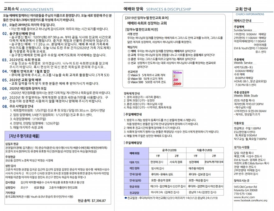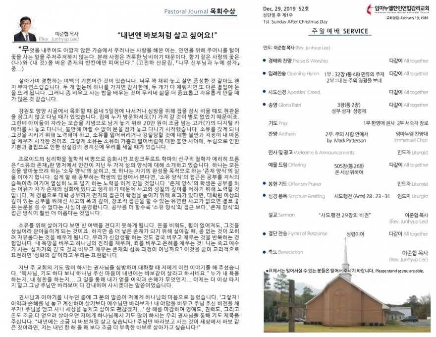 2019년 12월 29일 주일예배 주보 페이지 정보 작성자 임마누엘한인연합감리교회 댓글 0건 조회 6,044회 작성일 19-12-30 05:09 본문 2019년 12월 29일 주일예배 주보 목록 이전글2020년 1월 5일 주일예배 주보 20.01.06 다음글2019년 12월 22일 주일예배 주보 19.12.23
