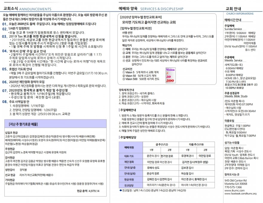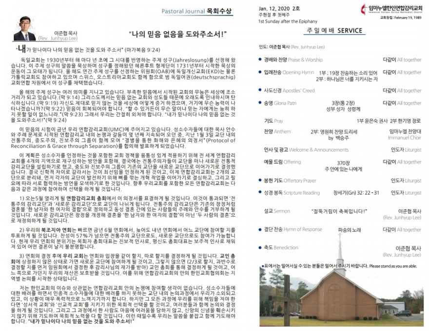 2020년 1월 12일 주일예배 주보 페이지 정보 작성자 임마누엘한인연합감리교회 댓글 0건 조회 5,253회 작성일 20-01-13 04:19 본문 2020년 1월 12일 주일예배 주보 목록 이전글2020년 1월 19일 주일예배 주보 20.01.20 다음글2020년 1월 5일 주일예배 주보 20.01.06